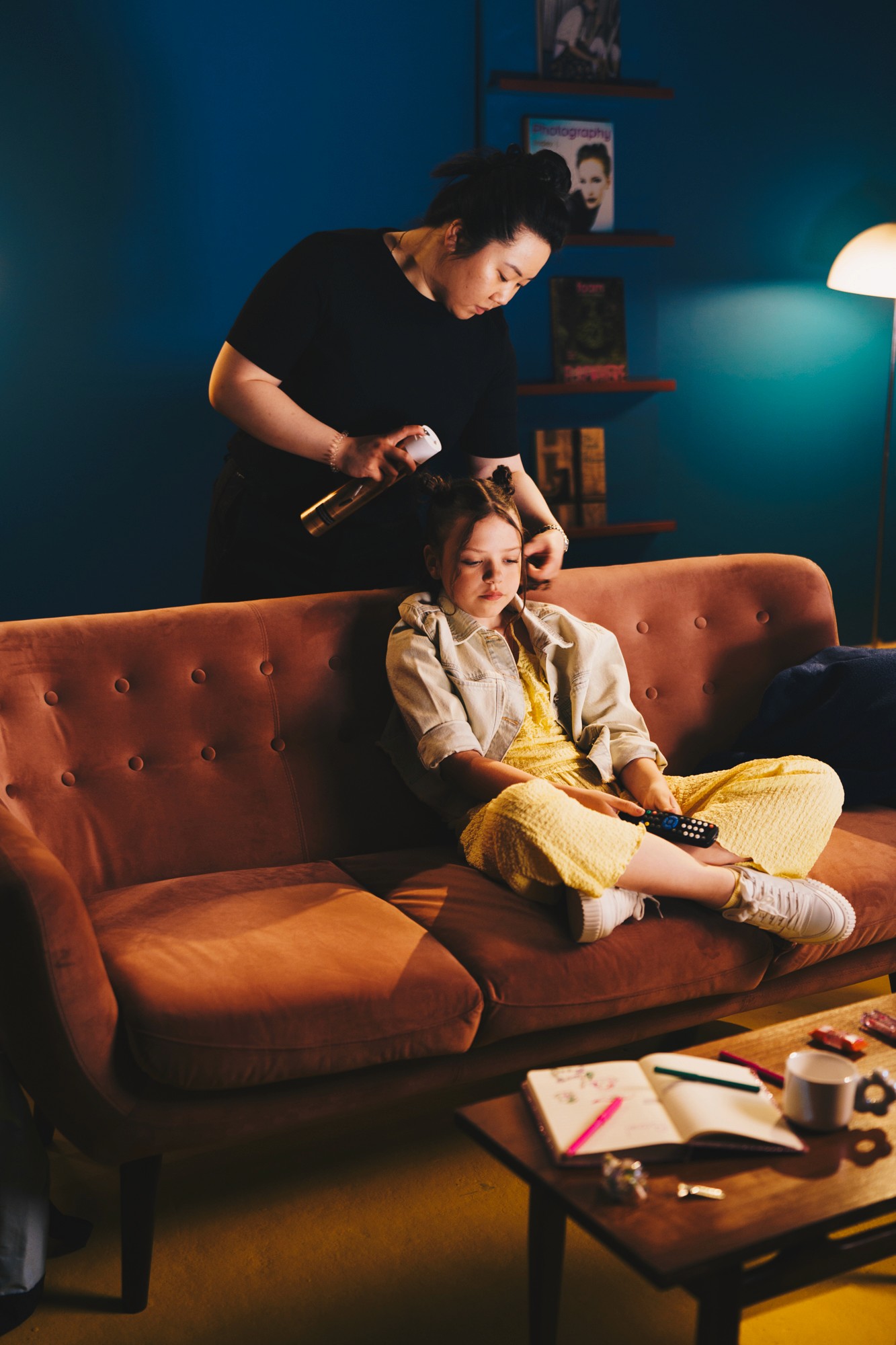 In the commercial, we follow a girl as she channel-surfs through different worlds. Each scene is distinct, each one carries a rating. We deliberately stripped away any cultural markers—the living room is abstract, stylized, deliberately nowhere and everywhere at once. Because this message needed to land the same way in Amsterdam as it does in Athens, in Berlin as it does in Barcelona.
